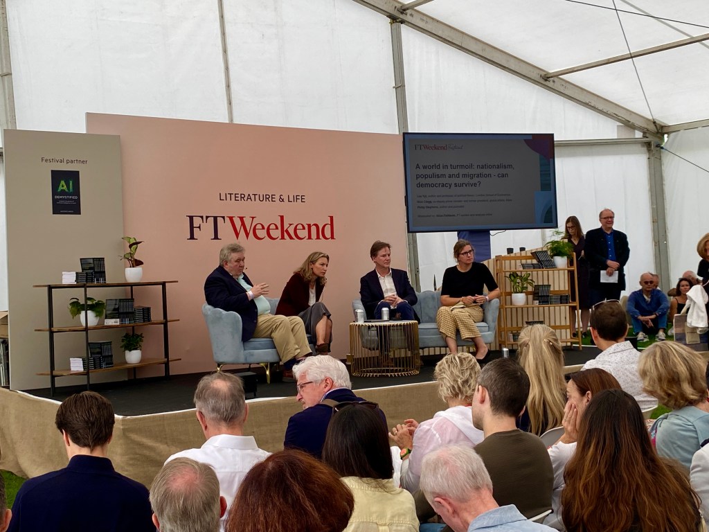 Photo: ‘A world in turmoil: nationalism, populism, migration, AI advances – can democracy survive?’ with Lea Ypi, Nick Clegg, Philip Stephens and Alice Fishburn.