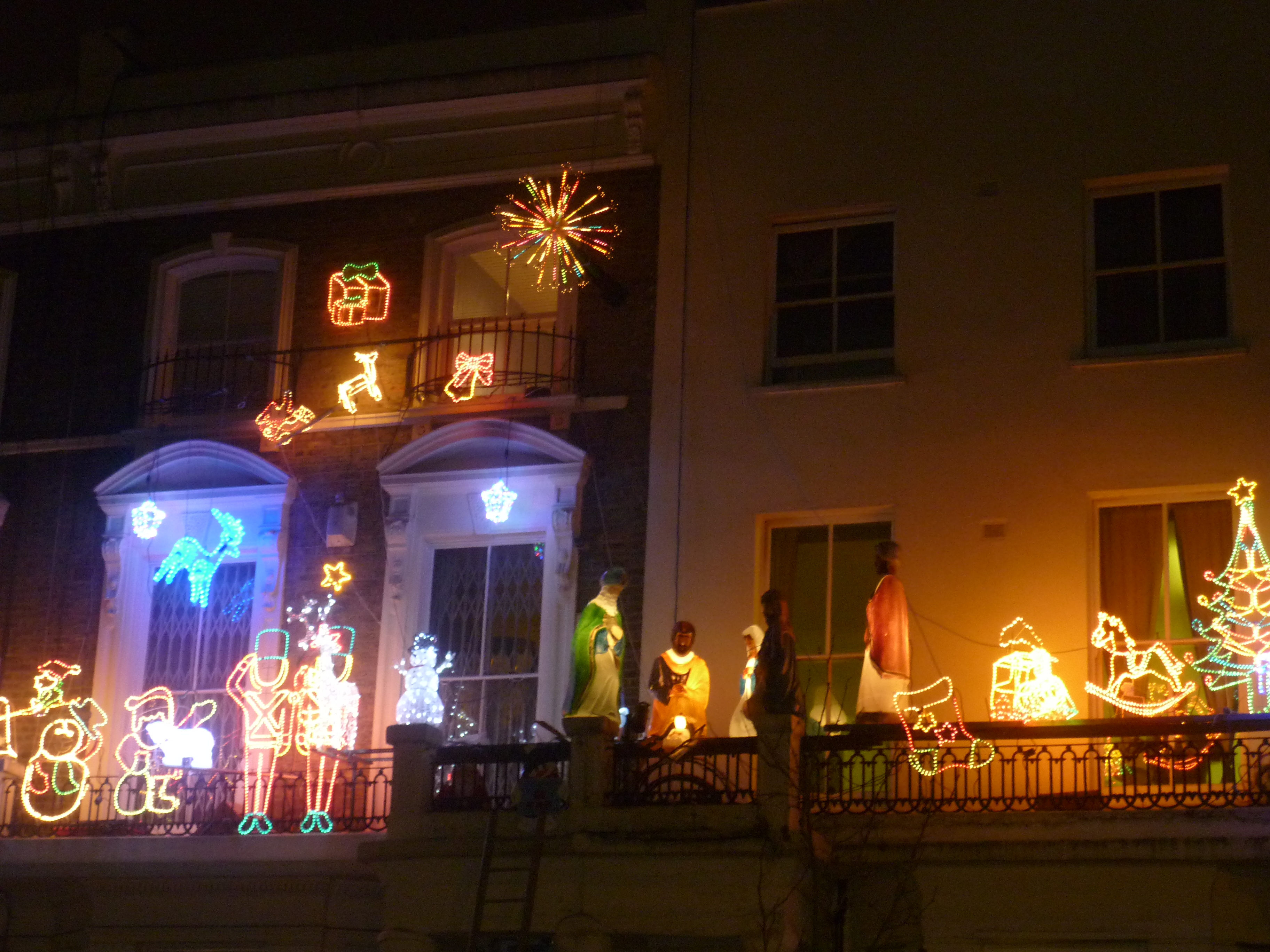 On leaving the shop I was startled to see someone on the balcony opposite. Not just any old balcony it must be noted, but one which for as long as I can remember has seen the most spectacular private display of Christmas lights in London: Shirland Road, W9.