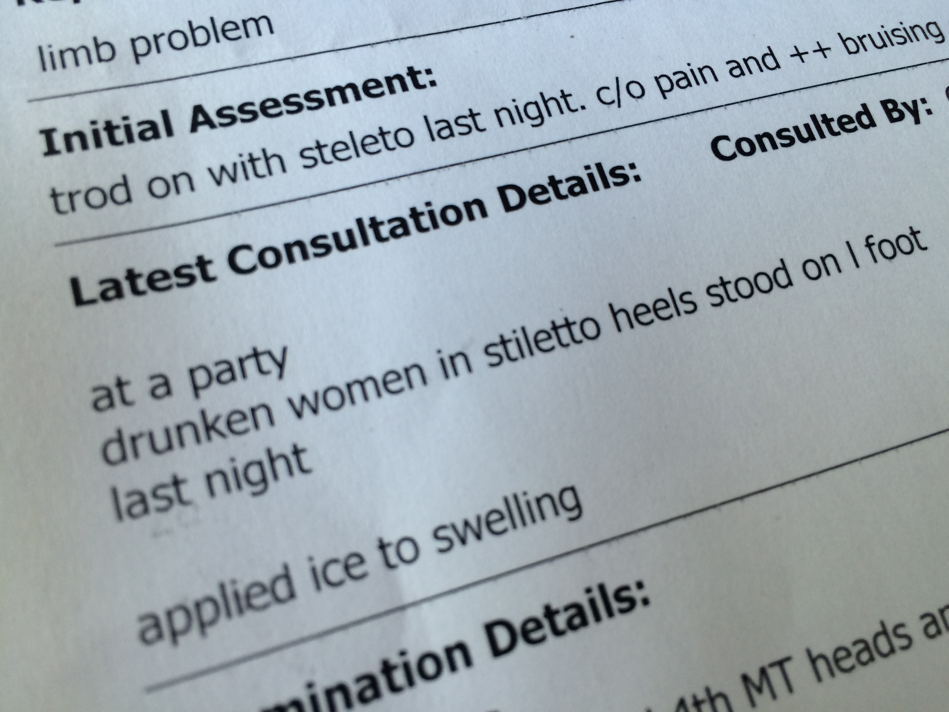 A golf ball sized lump met my horrified gaze. “We need to get some ice on that straight away!” T said. I vaguely remember glancing over to clock the culprit: Drunkenly green-dress clad with stilettos of at least 5″.