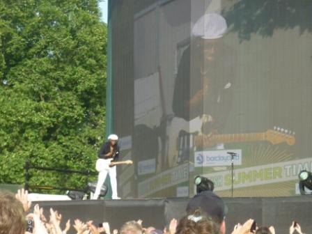 Poor Nile. Quarter of the way into the Chic set the sound went. Completely. The band played on as the audience started to holler: ‘We can’t hear you!’ How it took almost half an hour for the technical wizards to click something wasn’t working is a mystery. This was after all Hyde Park, central London with some of the biggest stars around strutting their stuff on the hottest day of the year so far.