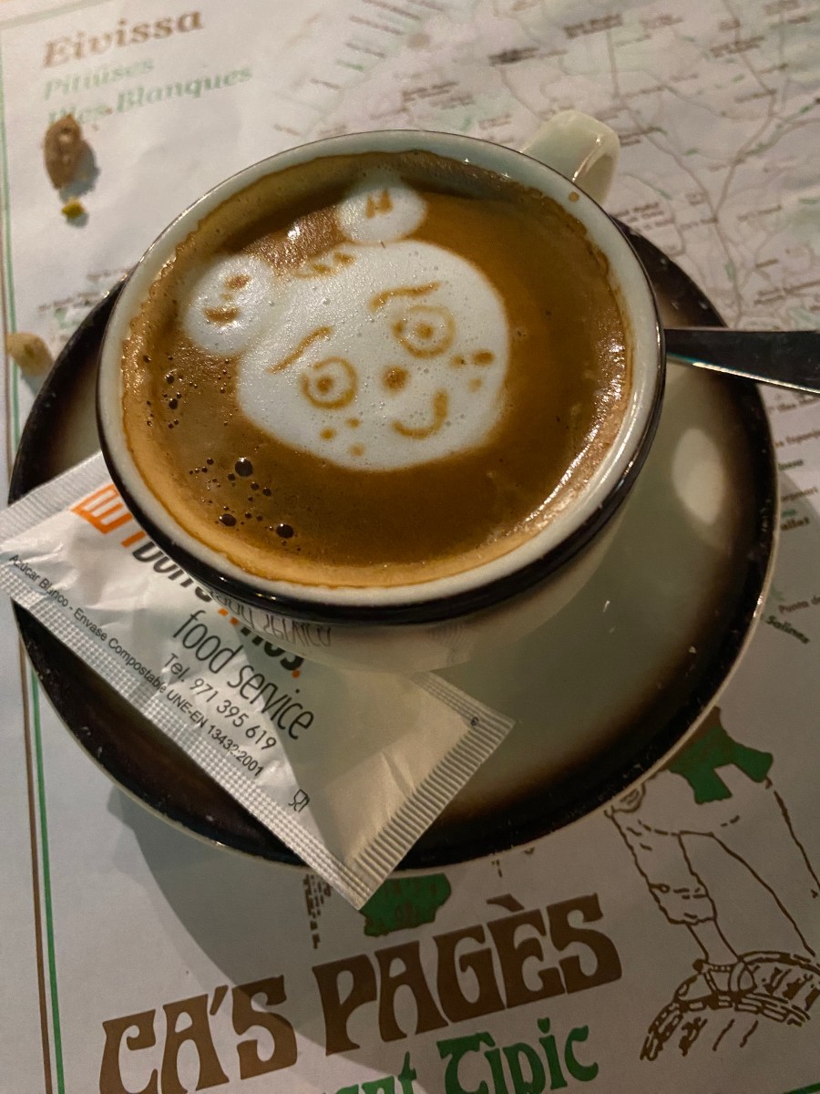 The Cortado arrived.  The arresting image of a mouse’s face, or was it a cat, stared up at me.  He was smiling, but the shape of his eyebrows suggested he had something on his mind, indeed that he was concerned, perhaps even worried. Spots where there could be whiskers – but weren’t – surrounded his dot of a nose, and his eyes – two circles surrounding pupils which wandered in alternative directions.  To be fair, this arresting apparition looked like he’d had a late night, or perhaps, not even slept at all.